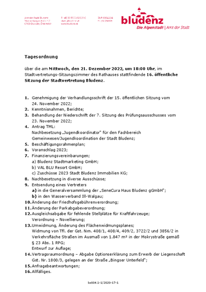 Tagesordnung Stadtvertretung 21.12.2022