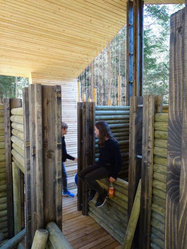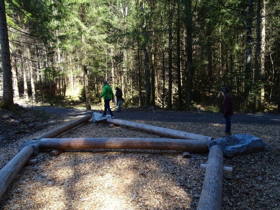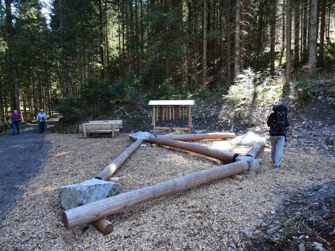 Belohnt werden die kleinen und großen Wanderinnen und Wanderer mit einem von der Bludenzer Zimmerei Neyer nach den Plänen des Architekturbüros Ender errichteten außergewöhnlichen Holzbau. Durch ein einfaches Stecksystem lassen sich Wände aufziehen, an der Seite sind Klanghölzer angebracht. Ein Jausentisch und Balancierhölzer laden zum längerem Verweilen ein. Geht man noch etwas weiter Richtung Gasünd, entdeckt man eine größer angelegte Balancierstrecke und ein Holzxylophon.