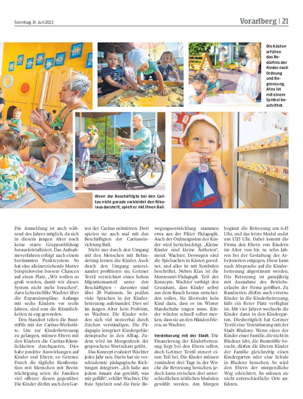 Die Getzner Textil AG setzt mit einer betriebseigenen Kinderbetreuung ein deutliches Zeichen zur besseren Vereinbarkeit von Familie und Beruf der MitarbeiterInnen.