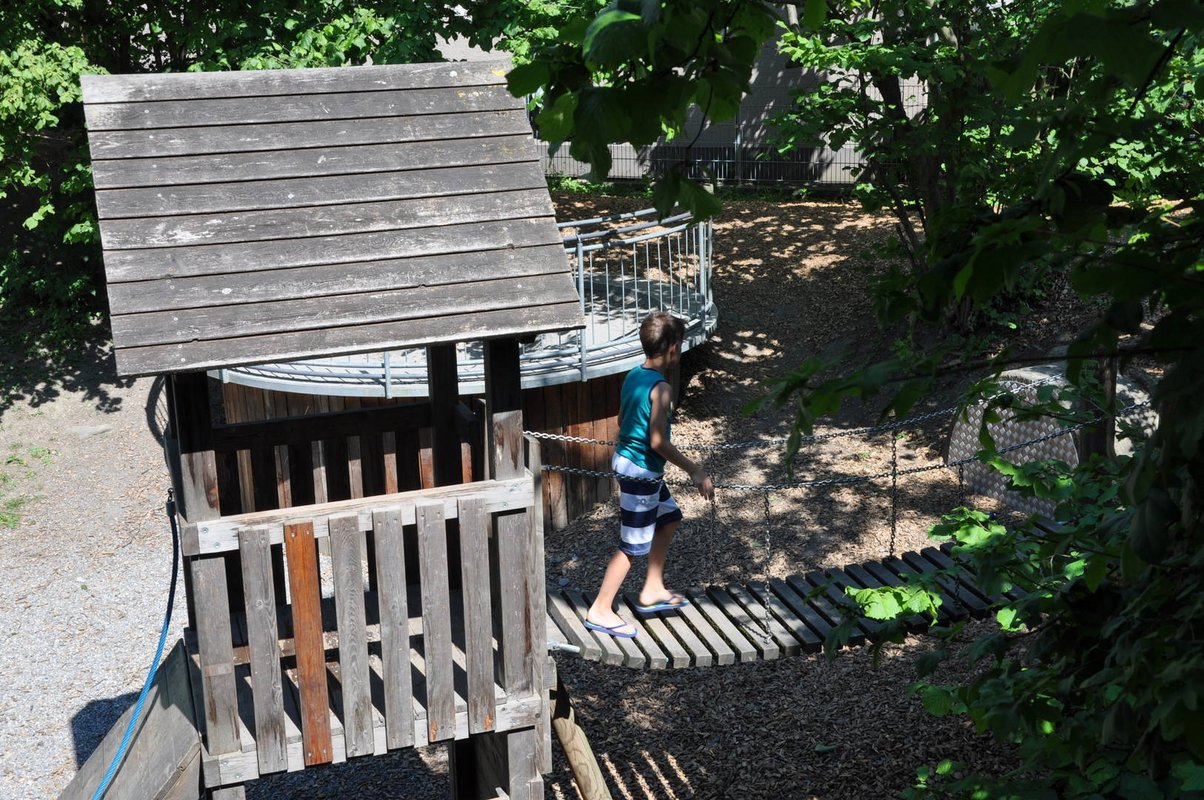Der Spielplatz bietet auf der oberen Ebene Spielgeräte für kleinere Kinder wie Sandkasten, Gigagampfa und schwenkbarem Kran. Mit der großen, geschwungenen Rutsche gelangt man in die untere Ebene, wo für die älteren Kinder ein Spielehaus mit Hängebrücke, eine kleine Kletterwand und viele Büsche zum Verstecken warten. Es gibt aber natürlich auch noch eine Schaukel und sogar ein Karussell.