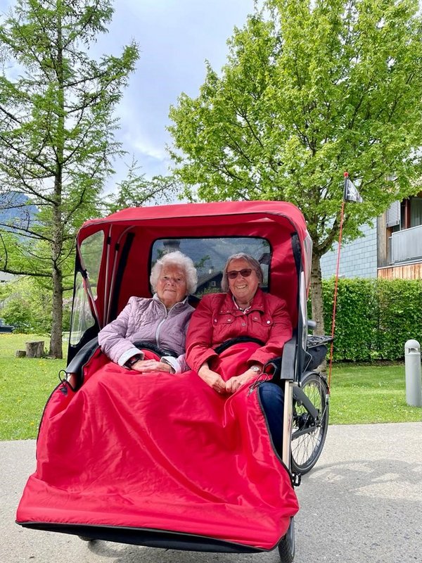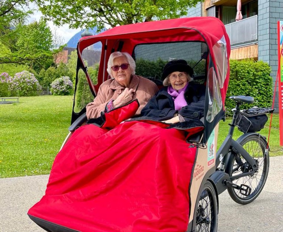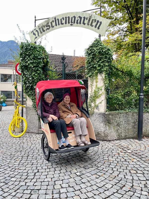 Die Stadt Bludenz mit der Rikscha zu erkunden ist nicht nur ein spannendes Erlebnis, sondern sorgt zudem auch für gute Laune! So waren die Senior:innen des SeneCura Laurentius-Parks Bludenz zuletzt ganz aus dem Häuschen, als sie Platz in dem dreirädrigen Gefährt nahmen und einen gemeinsamen Ausflug zum Musikfest nach Bludenz machten. Die Kapelle sorgte mit traditioneller Marschmusik für großen Jubel und Applaus beim Publikum. Fitnesstrainer Florian Berlinger, der für das körperliche Wohlergehen der Bewohner*innen sorgt, unternimmt regelmäßig mit den rüstigen Ausflügler*innen Ausfahrten ins Grüne – so haben die Bewohner:innen Emma Goldner und Stefanie Wirth bereits mehrere Spazierfahrten genossen. Die beiden Senior*innen, die sich bereits seit über 60 Jahren kennen und befreundet sind, hatten viel Spaß an den gemeinsamen Fahrten. „Wir haben uns schon damals wöchentlich zum Austausch getroffen. Da wir nun beide im schönen SeneCura Laurentius-Park in Bludenz wohnen, können wir solche Spritztouren nun gemeinsamen genießen“, freut sich Bewohnerin Emma Goldner.