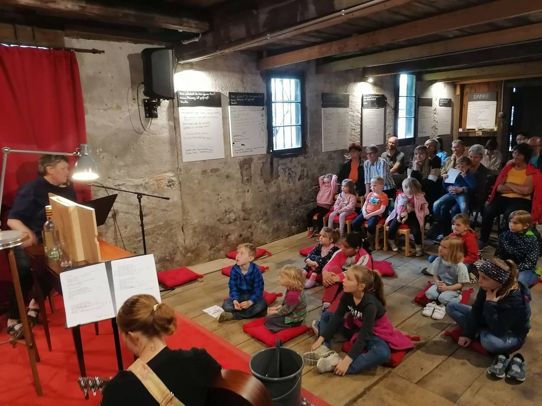 Viele begeistere Gesichter, euphorisches Mitklatschen und stellenweise sogar lautes Hundebellen – das junge Publikum von Isolde Adamek und Hanna Juriatti war sichtlich angetan von der Kinderlesung des kleinen „Ich bin Ichs“. Kamishibai ist ein japanisches Papiertheater, bei dem einzelne Bilder in einem Schaukasten präsentiert und dann – ganz wie im Bilderbuch – umgeblättert werden. Begleitet wurde Isolde Adamek von Hannah Juriatti und einem Sammelsurium von Instrumenten und kreativen Tonelementen.