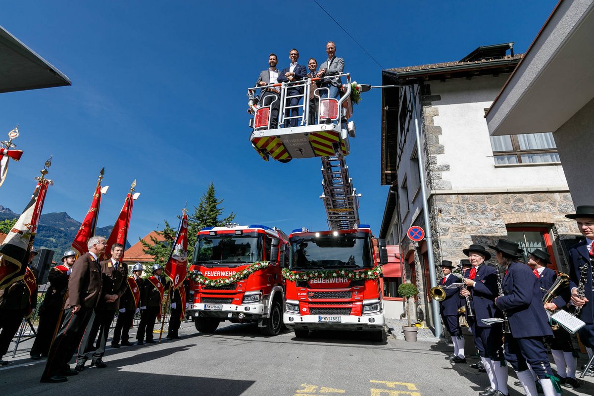 Nach rund 30 Jahren erhielt die Mannschaft der Feuerwehr Bludenz auch eine neue Drehleiter. Der Arbeitskorb der Hightech-Leiter bietet Platz für bis zu fünf Personen und kann zudem eine Kranken- und Schwerlasttrage aufnehmen. Die Drehleiter, die Einsätze auf einer Höhe bis zu 30 Metern ermöglicht, verfügt auch über einen elektrisch steuerbaren Wasserwerfer.