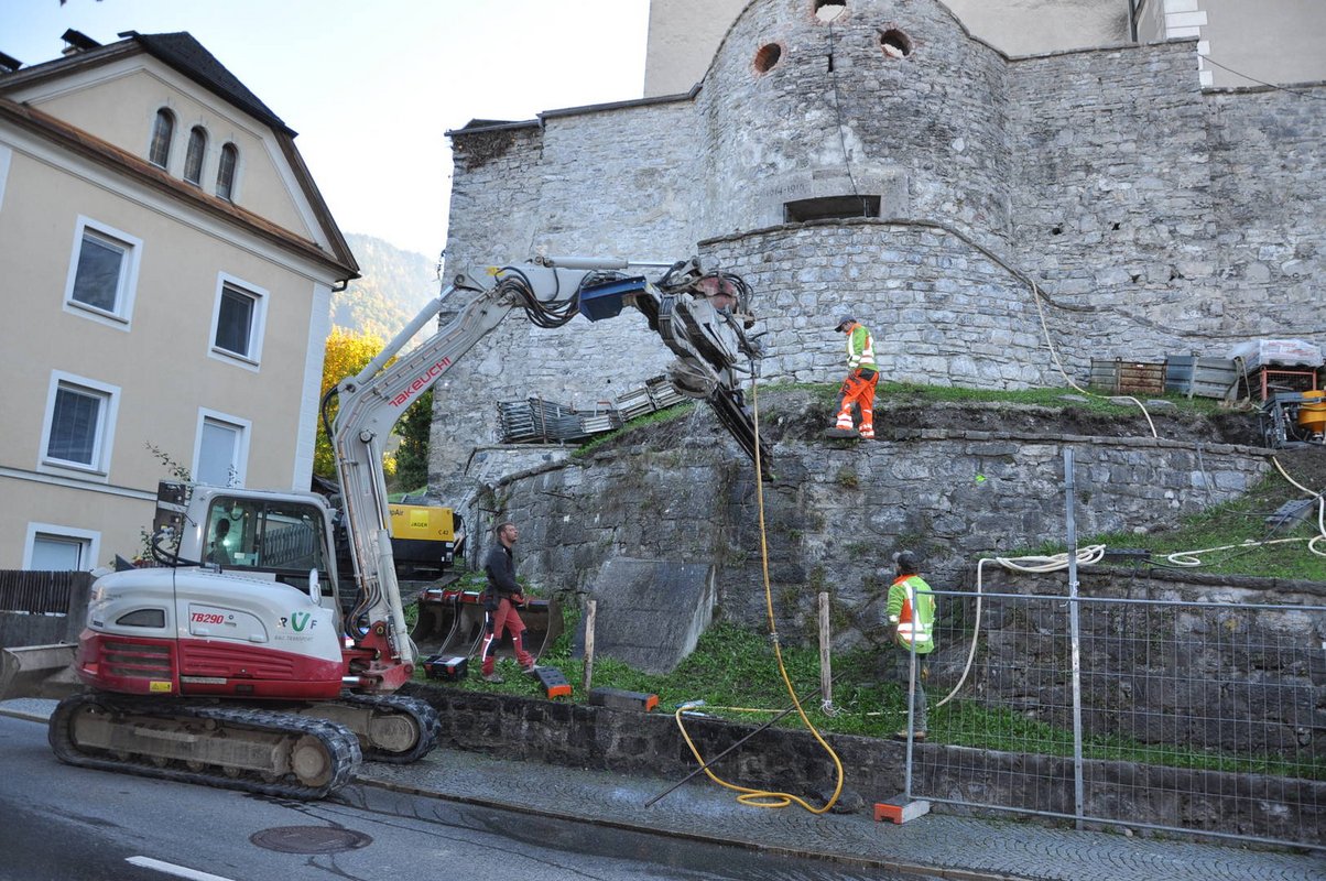 Unter Volldampf wird derzeit an der Sanierung des Bludenzer Kriegerdenkmales und der historischen Kirchenmauer gearbeitet. Die auf Trockenmauersanierung spezialisierte Firma Wilhelm + Mayer steht mitten in der 6. Sanierungsetappe. Dieser Tage wurden die Ankerbohrungen durchgeführt und Injektionsbohranker an der historischen Stadtmauer angebracht. Derzeit sind die Arbeiten an der Mauerfungensanierung im Gange.