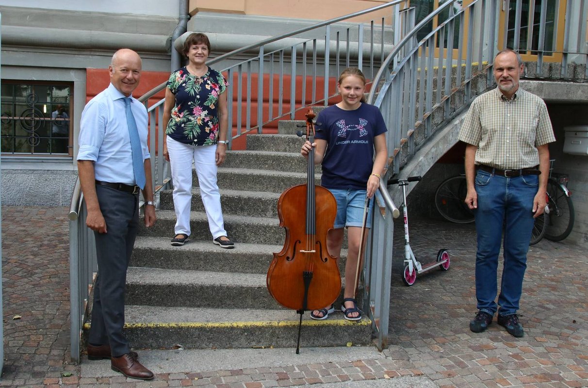 Vorstandsvorsitzender Christian Ertl von der Sparkasse Bludenz konnte kürzlich ein neues Violoncello an die Städtische Musikschule übergeben, worüber sich Sophia-Maria Thoma und ihre Lehrerin Agnes Téglás und Musikschuldirektor Thomas Greiner sehr freuten und ihren Dank dafür aussprachen.