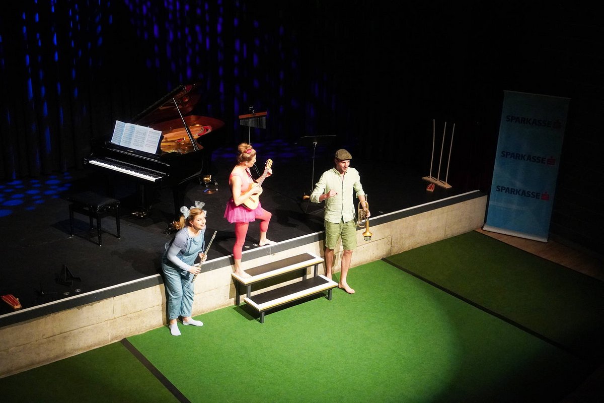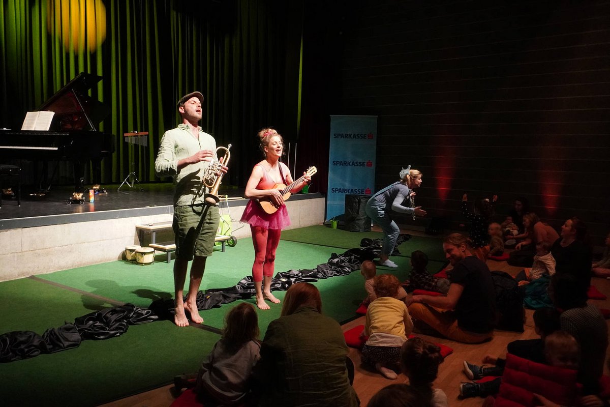Unter dem Titel „Spielen auf der Blumenwiese“ startete die Kleinkinderkonzertreihe am Dienstag, 22. März, um 14 und ein weiteres Mal um 16 Uhr, mit zwei restlos ausverkauften Vorstellungen in die nächste Runde. Diesmal kreuchte und fleuchte, klackte und knackste, summte und brummte es beim Konzert in der Remise. Und die junge Zuhörerschaft zeigte sich begeistert: Tanzen, Mitsingen, Klatschen und neugieriges Ausprobieren der Instrumente stand auf dem Programm. Auf der Bühne warteten summende Bienchen, singende Frösche, klingelnde Gänseblümchen, hustende Regenwürmer und tanzende Fische, die von den kleinen Besucher*innen begeistert entdeckt wurden. Das Trio „Pfiffikus“ ließ mit verschiedenen musikalischen Stilrichtungen und Genres nicht nur das junge Publikum mittanzen.